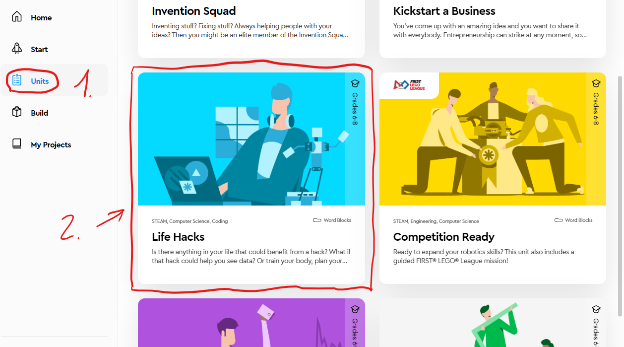 Dnes si zkusíme jednu z oficiálních lekcí z LEGO Spike. Po spuštění vybereme tlačítko Units, kde vybereme Life Hacks a zde Rain or shine.