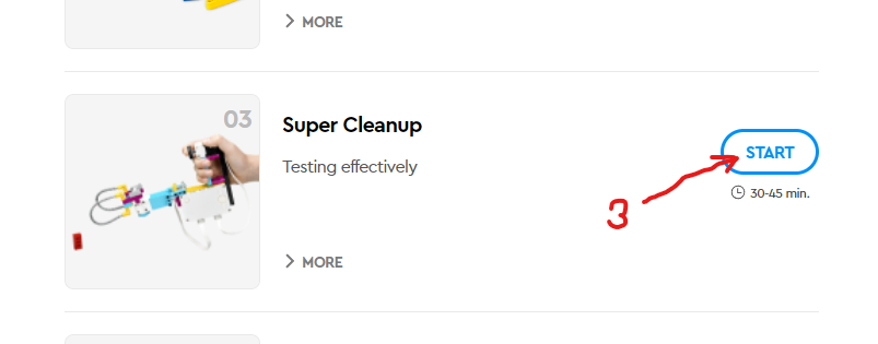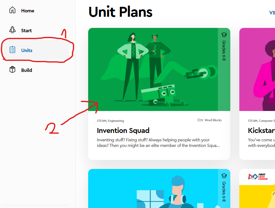 Dnes si zkusíme jednu z oficiálních lekcí z LEGO Spike. Po spuštění vybereme tlačítko Units, kde vybereme Invention Squad a zde Super Cleanup.